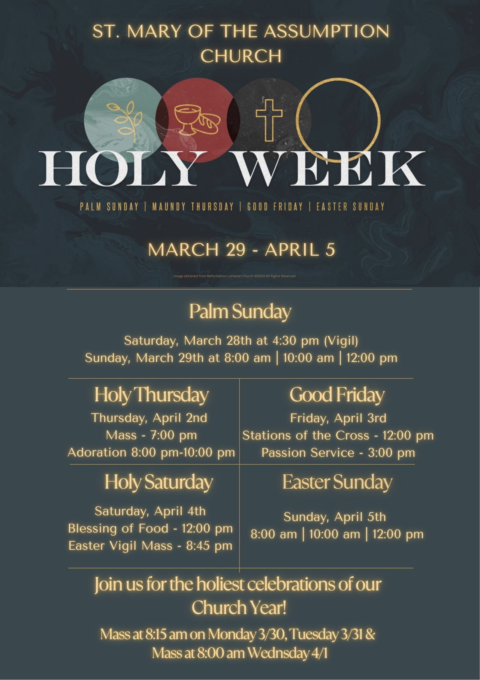 St. Mary of the Assumption Church’s mission is “To Evangelize God’s people, beginning with the Gift of the Holy Eucharist.” We are a vibrant and caring Catholic community with more than 2,300 families and the doors are always open to new members who want to join and worship God. We gather to be nourished by the Holy Eucharist so that we can work together to further God’s kingdom.