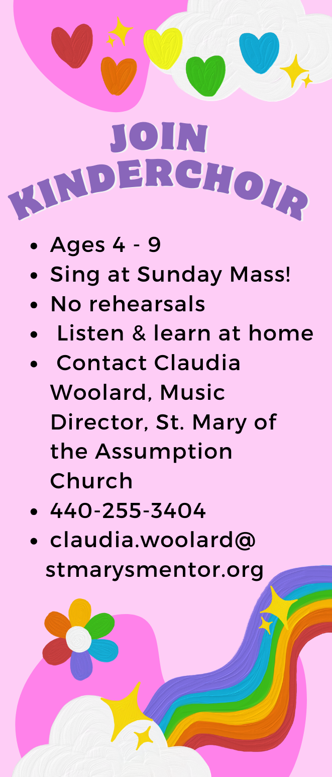 Experience in music is not required but is helpful. If interested or for more information, please contact the music director, Claudia Woolard, by email at claudia.woolard@stmarysmentor.org